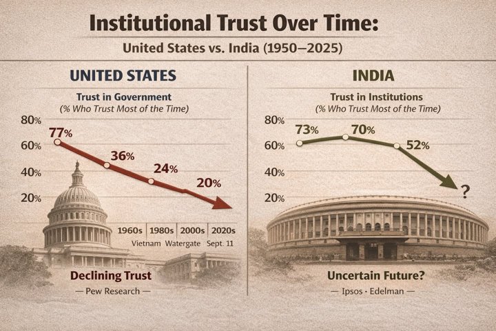 In recent years, public trust in the Indian government has been eroded by high-profile controversies, including the SC–ST Act enforcement debates, the UGC fiascos, and persistent judicial backlogs that delay justice. At the same time, the judiciary is taking undemocratic actions to maintain a pristine image. These issues are fueling growing distrust about the government’s ability to uphold democratic norms. Overall, the comparison highlights a key divergence in democratic attitudes. The United States demonstrates a long-term decline in institutional trust from mid-twentieth-century highs to historically low levels today. India, while lacking a continuous time series, has exhibited relatively higher levels of public confidence in government institutions across multiple surveys, until now. These contrasting trajectories may not be so contrasting from here on.