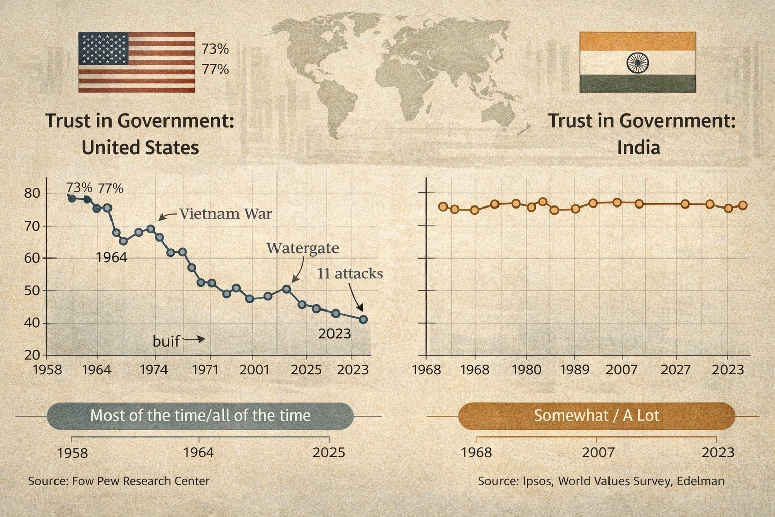 In recent years, public trust in the Indian government has been eroded by high-profile controversies, including the SC–ST Act enforcement debates, the UGC fiascos, and persistent judicial backlogs that delay justice. At the same time, the judiciary is taking undemocratic actions to maintain a pristine image. These issues are fueling growing distrust about the government’s ability to uphold democratic norms. Overall, the comparison highlights a key divergence in democratic attitudes. The United States demonstrates a long-term decline in institutional trust from mid-twentieth-century highs to historically low levels today. India, while lacking a continuous time series, has exhibited relatively higher levels of public confidence in government institutions across multiple surveys, until now. These contrasting trajectories may not be so contrasting from here on.
